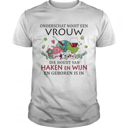 Onderschat nooit een vrouw die houdt van haken en wijn en geboren is in flowers shirt, hoodie, sweater, longsleeve and ladies t-shirt