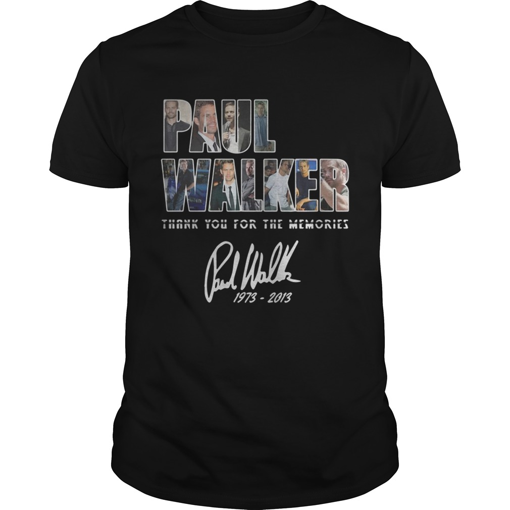 If you bleach out the Paul Walker thank you for the memories signature shirt . black of a t-shirt this becomes much more vibrant and it pops easier. It is also much softer. This happens because bleaching it out as opposed to putting a thick cover of ink over it. Instead of normal ink, discharge inks are used. This removes the shirt`s dye. It is related to bleaching in design, except it doesn`t damage the fibers. It will change the color to be whatever color you choose to.Keep in mind that the way those t-shirts react to the process of discharge printing can be different. Most printers have preferred textures and even preferred colors to work on when using this particular method.