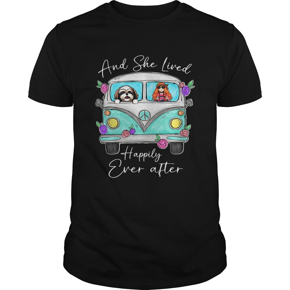Peace bus yorkie and she lived happily ever after flowers shirt, hoodie, sweater, longsleeve and ladies t-shirt