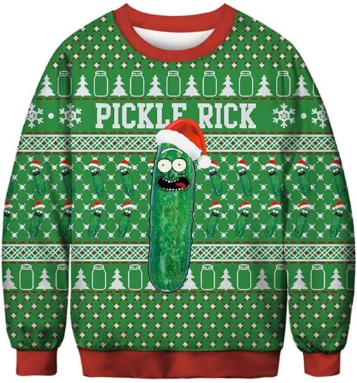 Are you a die-hard fan of the famous animated show and looking to add a touch of humor to your holiday wardrobe? Look no further than the Pickle Rick Christmas Ugly Sweatshirt. This sweatshirt is not your ordinary festive apparel; it’s a quirky blend of holiday cheer and pop culture reference that is sure to turn heads at any holiday gathering. Featuring the iconic Pickle Rick character from the show, adorned with a Santa hat and surrounded by colorful Christmas lights, this sweatshirt is a playful nod to both the holiday season and the beloved series. Whether you’re binge-watching your favorite episodes or spreading Christmas joy, this sweatshirt is the perfect conversation starter that will showcase your unique sense of style and humor.