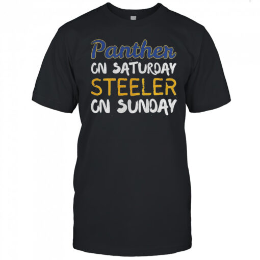 Elevate your game day attire and stand out from the crowd with the Pittsburgh Steelers Pitt Panthers Panthers on Saturday Steelers on Sunday shirt. Crafted from high-quality, breathable fabric, this shirt ensures both comfort and style all day long. The striking design and meticulous attention to detail make it a standout piece in any fan’s wardrobe. Donning this shirt not only shows your unwavering support for your favorite teams but also lets you express your passion for football in a fashion-forward way. Don’t miss out on the opportunity to sport this unique shirt and make a bold statement at the next game. Upgrade your fan gear now and let your team pride shine with this exclusive shirt!