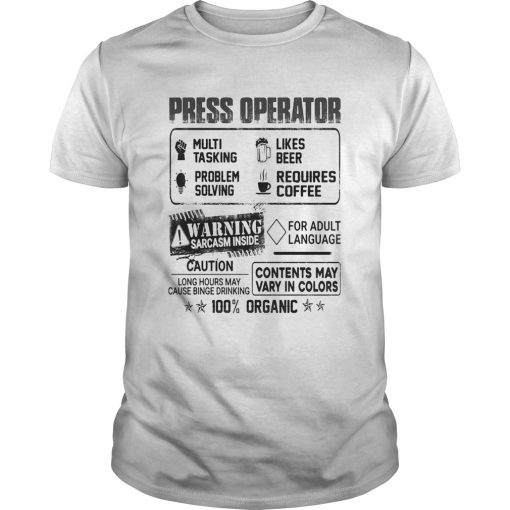 Press operator warning sarcasm inside caution contents may vary in color 100 percent organic shirt, hoodie, sweater, longsleeve and ladies t-shirt