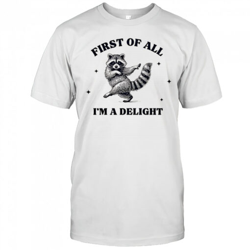 Raccoon dancing first of all I’m a delight shirt, hoodie, sweater, longsleeve and ladies t-shirt