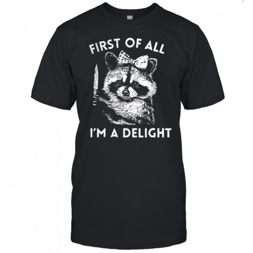 Raccoon first of all I’m a delight meme shirt, hoodie, sweater, longsleeve and ladies t-shirt