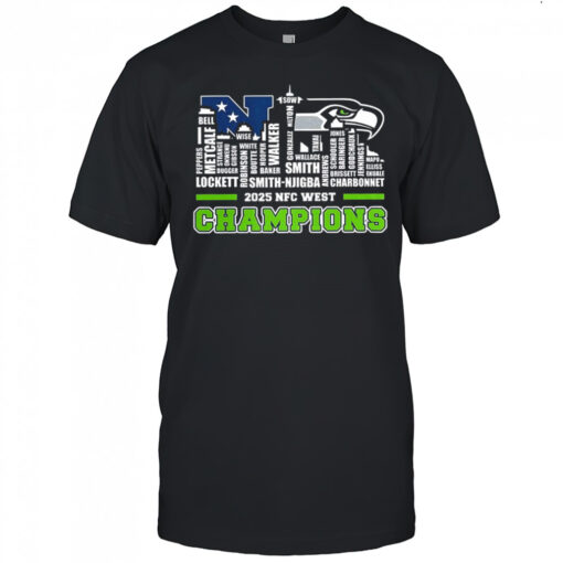Seattle Seahawks NFC West 2025 Champions name player city skyline shirt, hoodie, sweater, longsleeve and ladies t-shirt