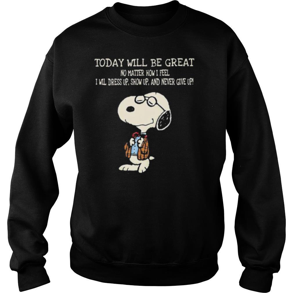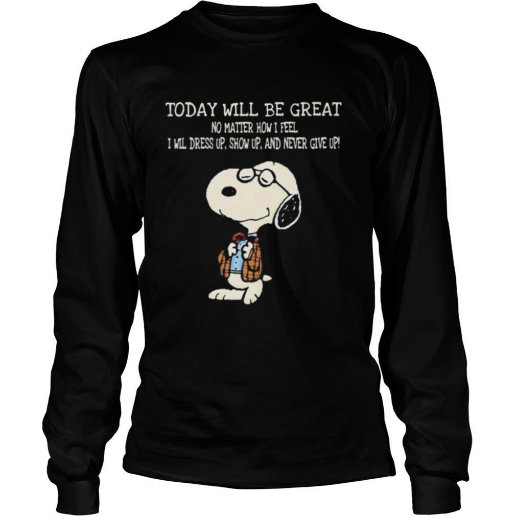 Snoopy today will be great no matter how i feel i will dress up show up and never give up shirt, hoodie, sweater, longsleeve and ladies t-shirt