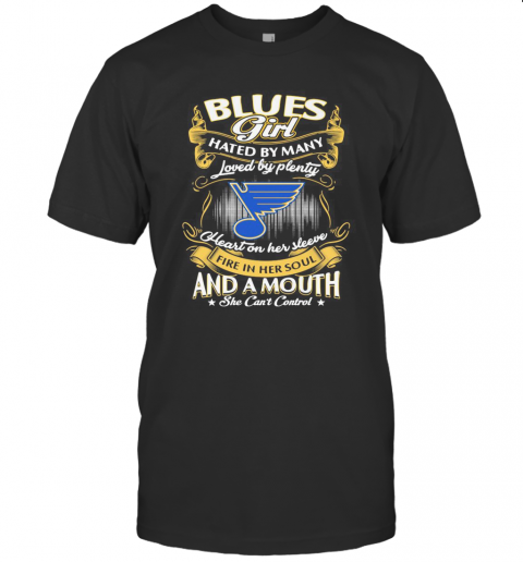 St. Louis Blues Girl Hated By Many Loved By Plenty Heart On Her Sleeve Fire In Her Soul And A Mouth She Can’T Control Stars T-Shirt