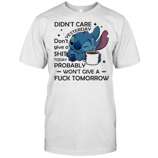 Stitch coffee didn’t care yesterday don’t give a shit today probably won’t give a fuck tomorrow shirt, hoodie, sweater, longsleeve and ladies t-shirt