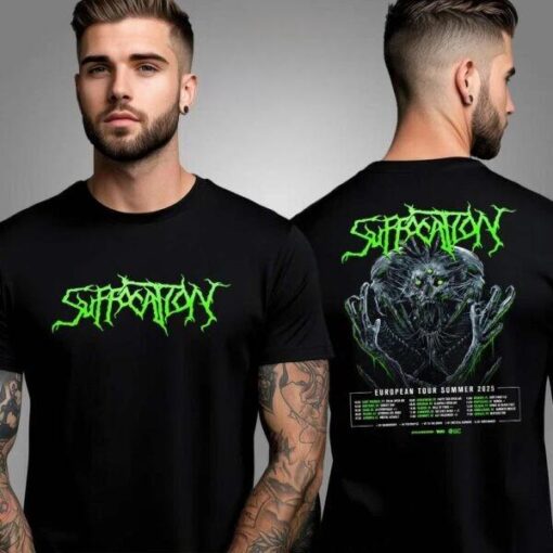 Our Suffocation European Tour Summer 2025 Schedule Two Sided T-Shirt is not just a piece of clothing; it’s an experience waiting to be worn. Imagine yourself immersed in the vibrant music scene of Europe, feeling the adrenaline of live performances, and the camaraderie of fellow music enthusiasts. This unique t-shirt encapsulates the essence of a summer adventure, blending style with memories that will last a lifetime. The front of the shirt showcases the bold and edgy design of the Suffocation European Tour logo, symbolizing energy and passion. On the back, the 2025 schedule is proudly displayed, a roadmap to the hottest music destinations across the continent. Whether you’re attending concerts, exploring new cities, or simply hanging out with friends, this t-shirt is a statement piece that sets you apart as a true music aficionado.