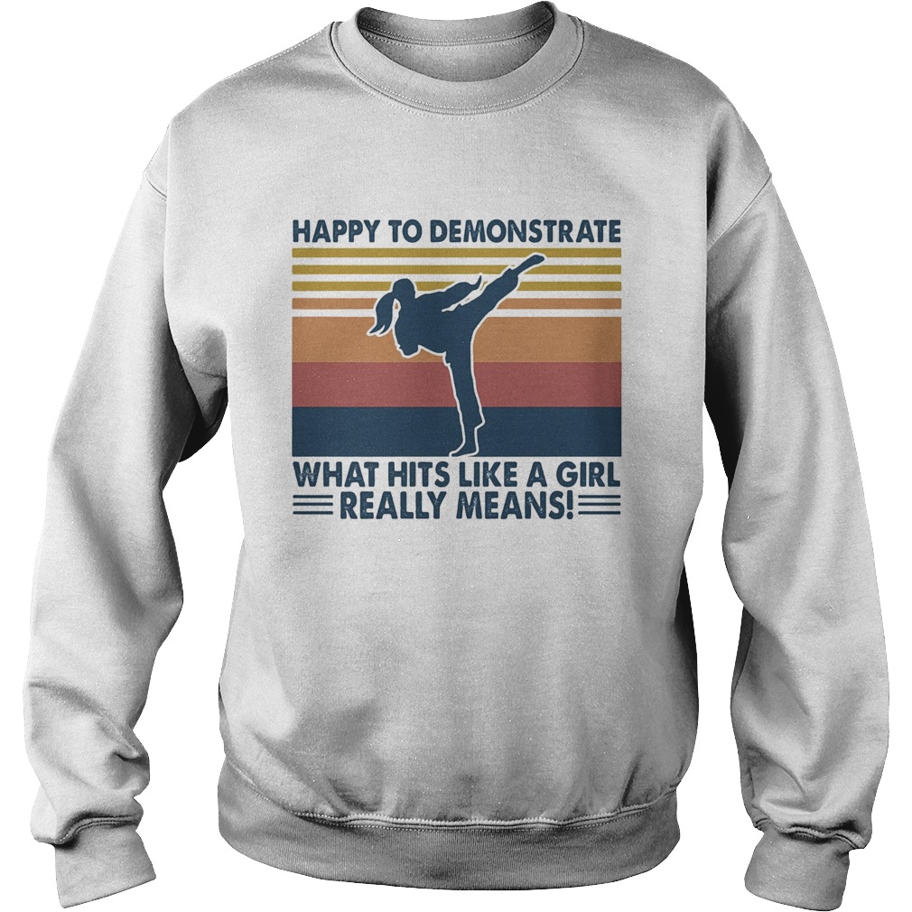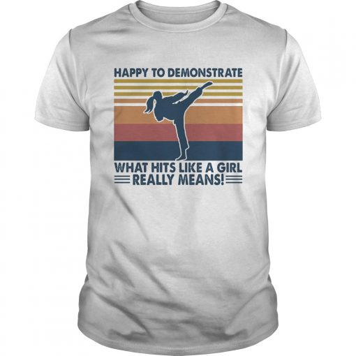 Taekwondo happy to demonstrate what hits like a girl really means vintage shirt, hoodie, sweater, longsleeve and ladies t-shirt