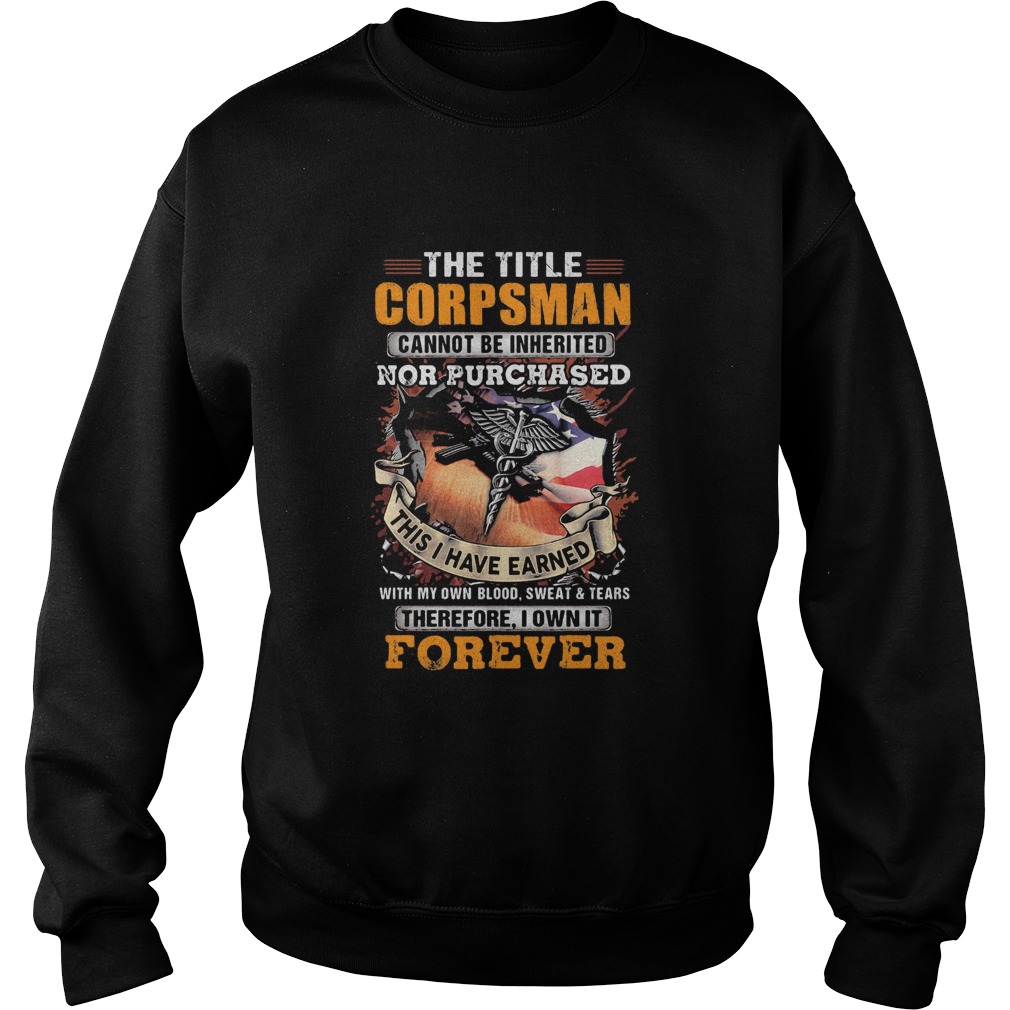 The title corpsman cannot be inherited nor purchased this I have earned forever shirt, hoodie, sweater, longsleeve and ladies t-shirt