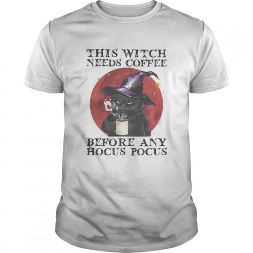 THIS WITCH NEEDS COFFEE BEFORE ANY HOCUS POCUS SUNSET BLACK CAT shirt, hoodie, sweater, longsleeve and ladies t-shirt