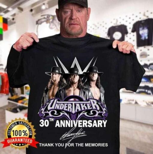 Stepping into the ring of nostalgia, the Undertaker 30th Anniversary Thank You For The Memories Signatures T-Shirt Merch stands as a tribute to an icon who has etched his legacy in the hearts of millions. This exclusive piece of merchandise not only pays homage to The Deadman’s three decades of dominance but also encapsulates the essence of a wrestling era that defined a generation. The design, a seamless blend of vintage aesthetics and modern flair, features a collage of iconic moments from The Undertaker’s illustrious career, embellished with his autograph and a heartfelt message: “Thank You For The Memories.” Crafted with premium quality fabric, this t-shirt is not just an article of clothing but a statement piece for true wrestling aficionados. Whether worn to a live event, a watch party with friends, or simply as a daily reminder of wrestling’s golden age, this shirt is bound to spark conversations and evoke a sense of reverence for the legendary Undertaker.