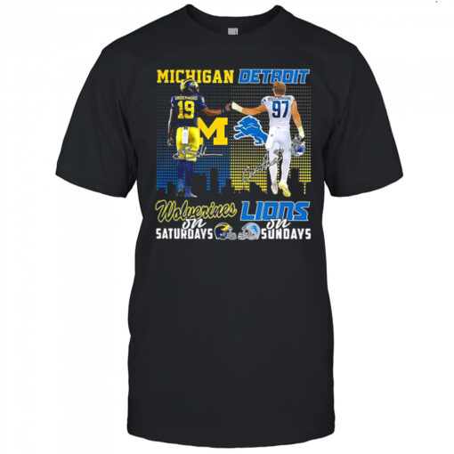 Get ready to show off your team pride with the Underwood Wolverines on Saturdays and Aidan Hutchinson Lions on Sundays signature shirt! Picture yourself on game day, sporting this exclusive shirt that lets you represent both of your favorite teams effortlessly. Crafted with premium quality materials, this shirt ensures comfort and style as you cheer your heart out for the Wolverines and Lions.