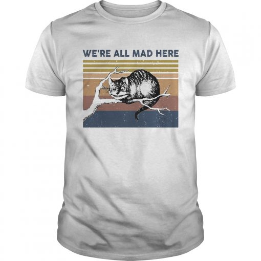 Were all mad here cat lying on tree vintage retro shirt, hoodie, sweater, longsleeve and ladies t-shirt