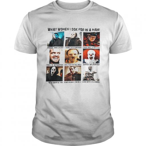 What women look for in a man strong and silent loves his mother Halloween shirt, hoodie, sweater, longsleeve and ladies t-shirt