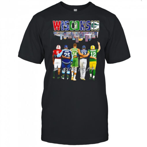 Embrace the spirit of Wisconsin sports with this unique Wisconsin Dilin Jones Noah Gravel Giannis Antetokounmpo Christian Yelich Aaron Rodgers Signatures Shirt. Stand out in the crowd and show your unwavering support for your favorite teams. Whether you’re cheering from the stands or watching from home, this shirt is the perfect way to celebrate the sporting excellence that defines Wisconsin. Don’t miss your chance to own a piece of history – grab your signature shirt today and let your pride shine through!