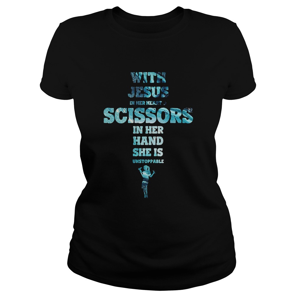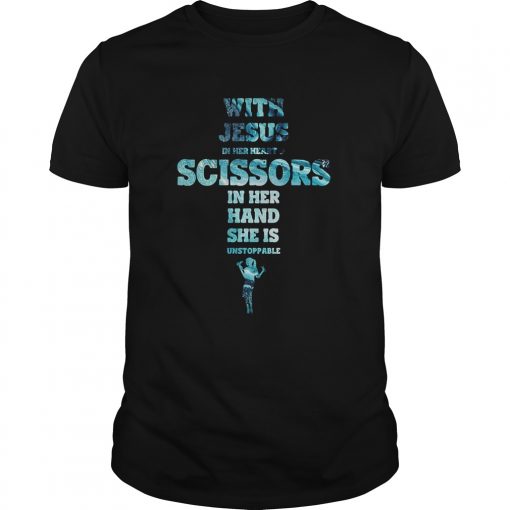 With Jesus In Her Heart And Scissors In Her Hand She Is Unstoppable shirt, hoodie, sweater, longsleeve and ladies t-shirt