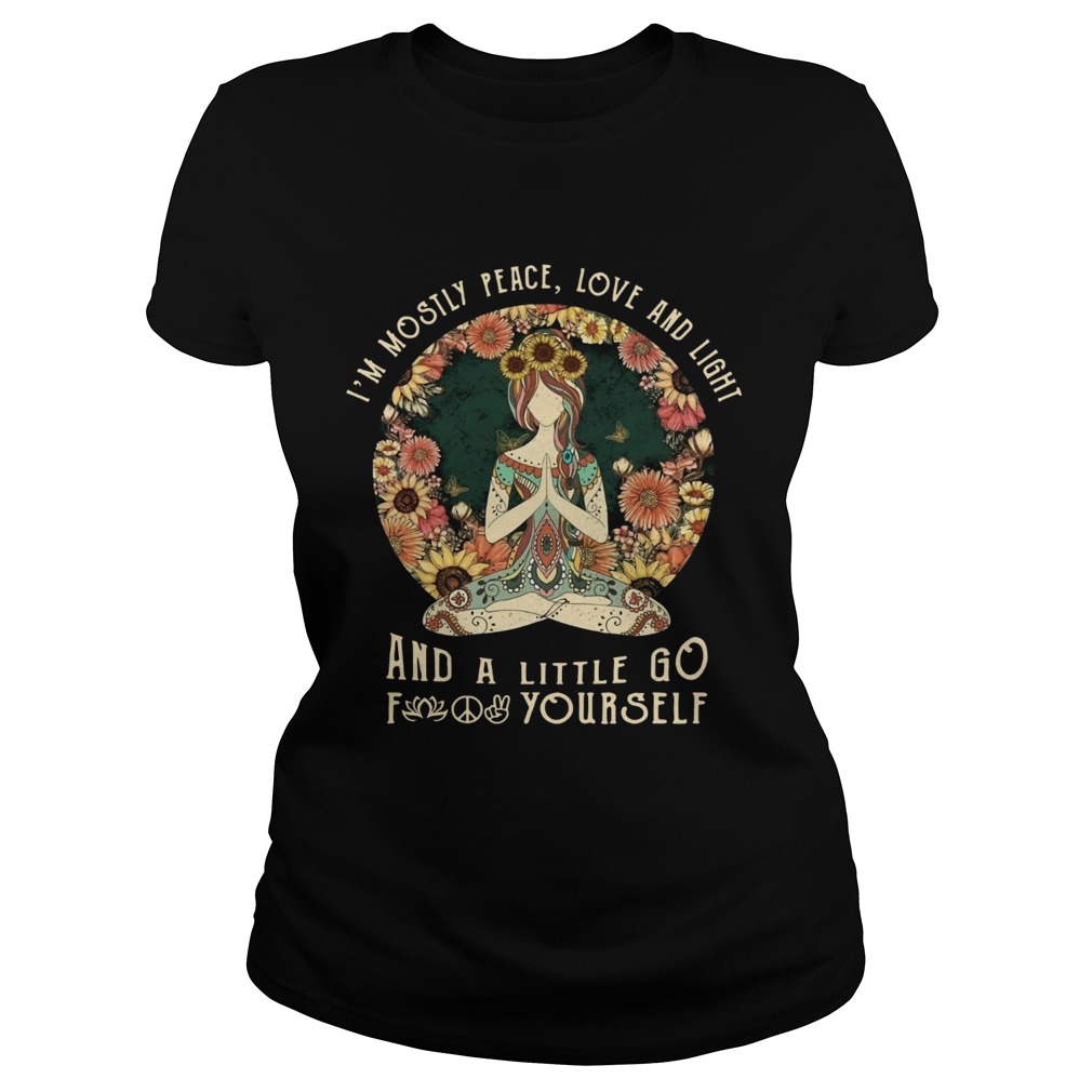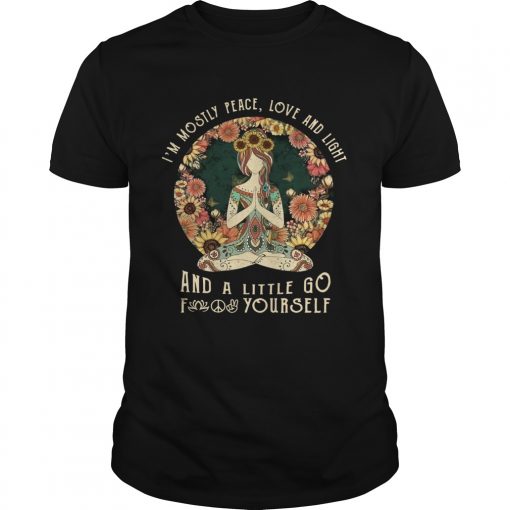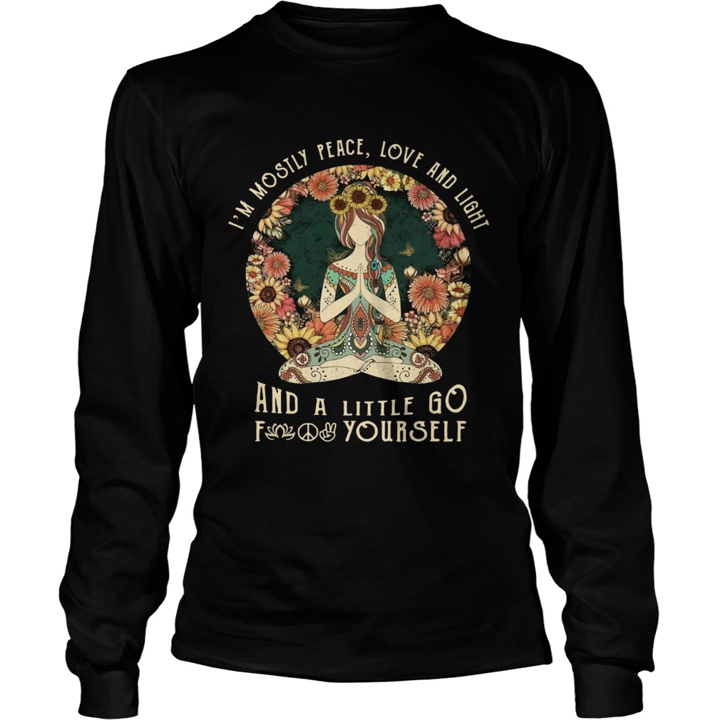 Yoga Im mostly peace love and light and a little go fuck yourself sunset shirt, hoodie, sweater, longsleeve and ladies t-shirt